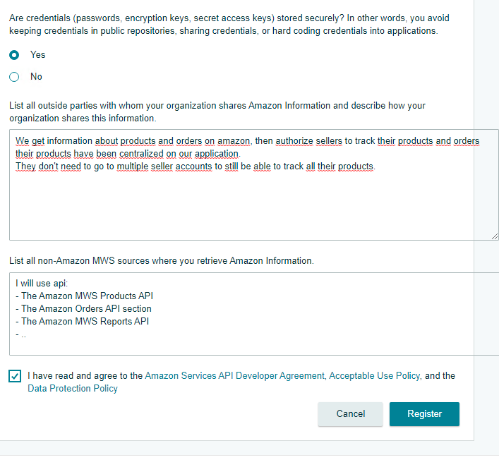 Sau khi hoàn thành bạn vui lòng ấn Register và đợi Amazon chấp nhận yêu cầu.